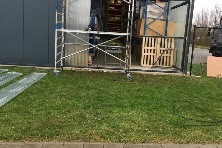 Durch einen heftigen Sturm wurden die Polycarbonatplatten an der Ecke dieses Unternehmensgebäudes stark beschädigt. Unsere Paneel-Experten haben die beschädigten Platten entfernt und neue Platten montiert.